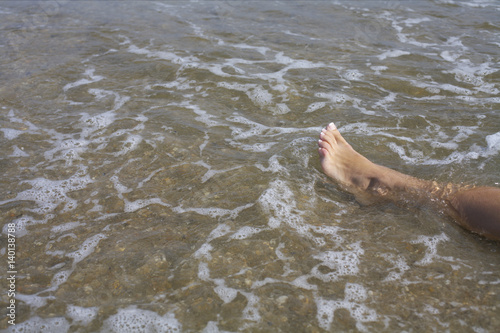 Obraz premium Naked leg of a young woman in the shallow water of the sea, high angle view