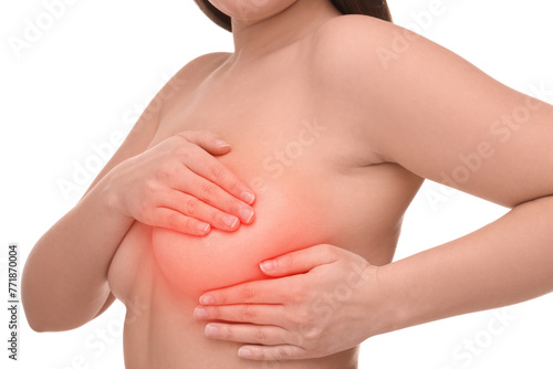 © New Africa, Fototapeta premium Naked young woman suffering from breast pain on white background, closeup
