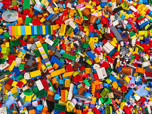 © JinnaritT, Naklejka premium NAKHON PATHOM,THAILAND - JANUARY 17 ,2025 : Top view A pile of multicolor of many Lego toy blocks in various shapes and different sizes at Central salaya. Toys and games. Leisure and recreation.