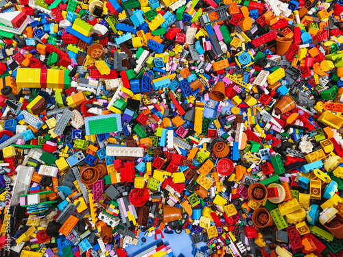 © JinnaritT, Obraz premium NAKHON PATHOM,THAILAND - JANUARY 17 ,2025 : Top view A pile of multicolor of many Lego toy blocks in various shapes and different sizes at Central salaya. Toys and games. Leisure and recreation.