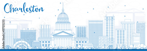 Obraz premium Nakreśl panoramę Charleston z niebieskimi budynkami.