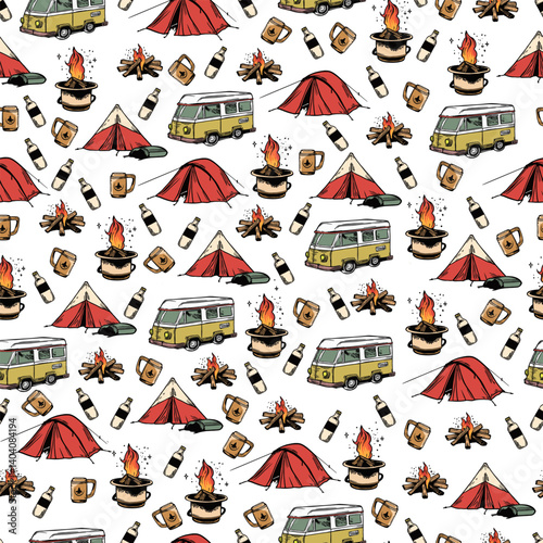 © Kateryna, Fototapeta premium **Name:** "Camping Adventure Patterns – Seamless Outdoor Designs with Tents, Campfires, Hiking Gear, Wildlife, and Nature Elements"