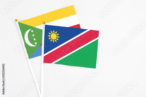 © sezerozger, Naklejka premium Namibia and Comoros stick flags on white background. High quality fabric, miniature national flag. Peaceful global concept.White floor for copy space.