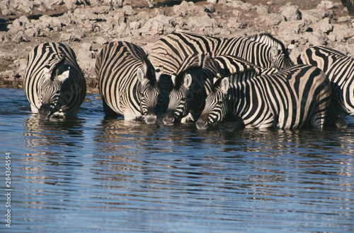 Fototapeta premium Namibia, Etosha National Park, Burchell's zebras (Equus burchellii) drinking...