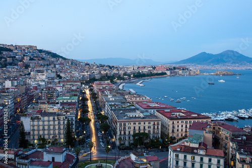 © Bolucevschi, Obraz premium Naples waterfront cityscape depicting urban density coastal panorama usable in travel promo or architectural lighting design, illustrating sunset ambiance over Mediterranean harbour in low light