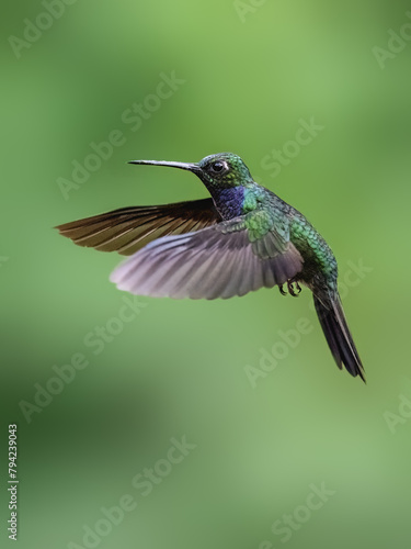 Fototapeta premium Napo Sabrewing Hummingbird in flight on green background