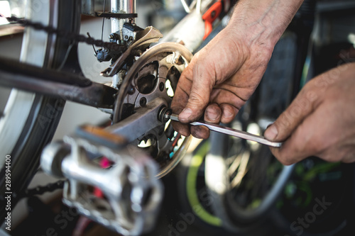 © romul014, Obraz premium Naprawianie problemu z rowerem w warsztacie