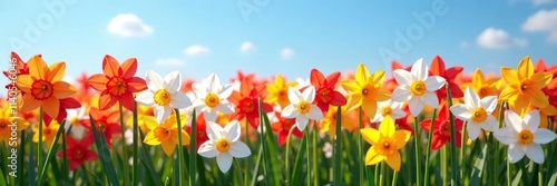 Fototapeta premium Narcissi in full bloom create a stunning mosaic against the clear blue sky, field of flowers, colorful, spring flowers
