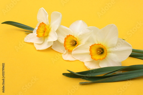 Fototapeta premium Narcissus flowers lie on a yellow background.