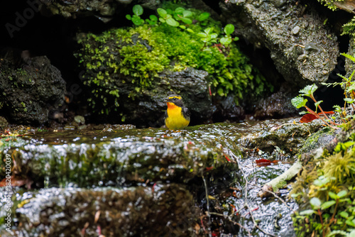 Obraz premium キビタキ, Narcissus Flycatcher, Ficedula narcissina, ヒタキ科 山梨県富士吉田市大洞の水場-2025 山中湖の別荘地内にある水場。 崖から美しい清水が湧くポイントで、古くから登山者が水を飲んだり、野鳥が水浴びをしたりする。