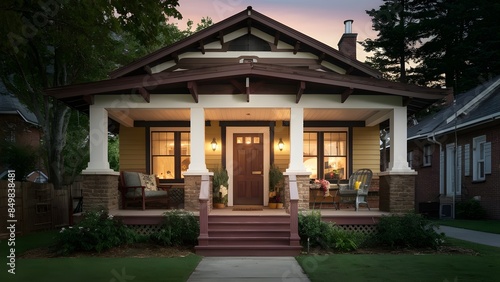 Obraz premium "Narrate a peaceful evening on the porch of a Craftsman bungalow."