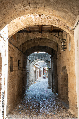 Fototapeta premium Narrow alley (Agiou Fanouriou) with stone arches in the medieval town quarter of Rhodes, Greece.