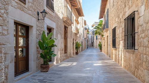© siraphol, Obraz premium Narrow alley between tall stone buildings with soft light creates serene atmosphere