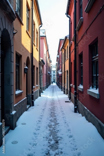 © tpadobestock, Fototapeta premium Narrow alley, snow-covered buildings, soft morning light, snow, path, sunrise
