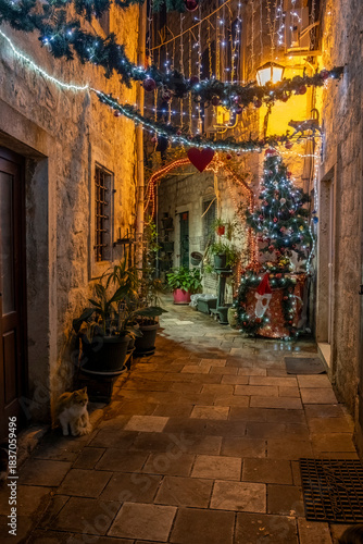 Fototapeta premium Narrow alley with cats decorated with garland and string lights in Kotor