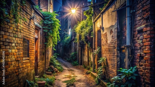 Fototapeta premium Narrow alleyway in a slum with crumbling brick walls and overgrown vegetation, dimly lit by a single flickering streetlight, urban neglect, dim lighting