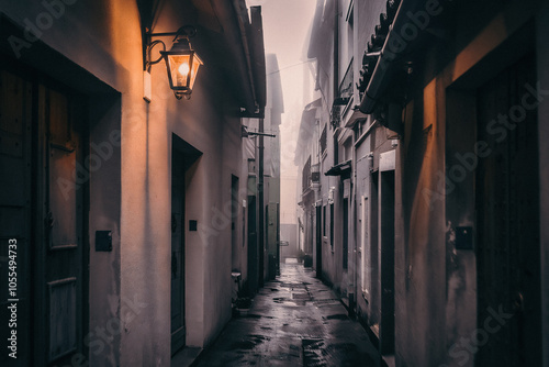 Obraz premium narrow alleyways in a historic part of the city, where fog creates an intimate, mysterious feel, and dim lights barely illuminate the area.