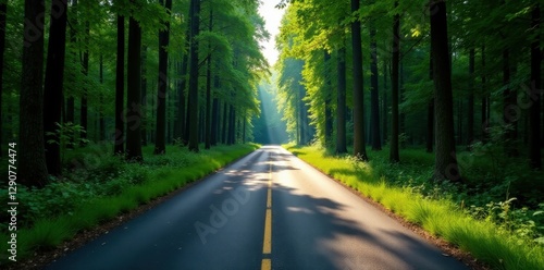 Obraz premium Narrow asphalt road through dense forest, shadows long, shady, journey, forest road