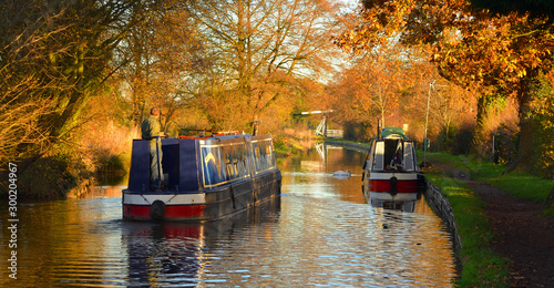 © harlequin9, Naklejka premium Narrow boats on the Llangollen canal, at Wrenbry boats and reflections in Autumn