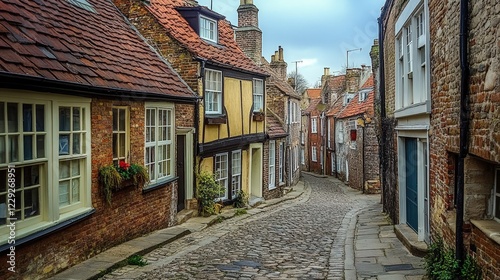 © wicha, Fototapeta premium narrow, cobbled street in a historical district, where the buildings are so close that they seem to lean in towards each other.