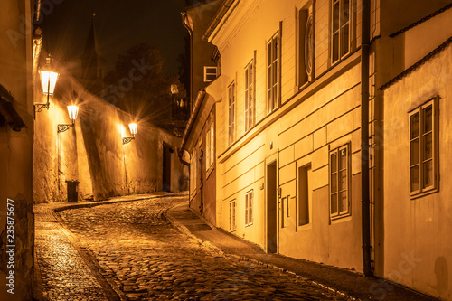 Obraz premium Narrow cobbled street in old medieval town with illuminated houses by vintage street lamps, Novy svet, Prague, Czech Republic. Night shot.