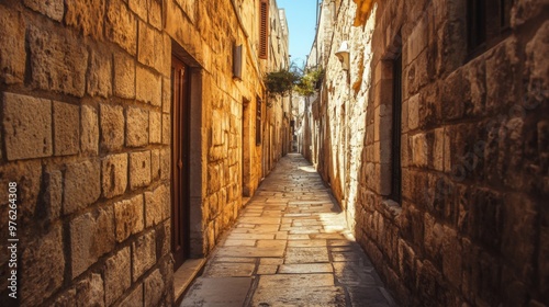© musa, Fototapeta premium Narrow cobblestone alleyway between stone buildings with a door and a window in an old European city.