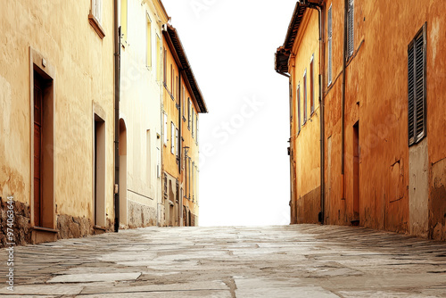 © Sodapeaw, Fototapeta premium Narrow cobblestone street lined with rustic orange and yellow buildings, creating a quaint and charming atmosphere.