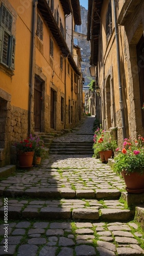 © Tamazina, Fototapeta premium Narrow, cobblestone street winds its way uphill between rows of old, colorful buildings. Sunlight casts long shadows on street, highlighting texture of stones.