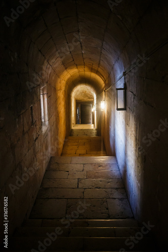 Fototapeta premium Narrow corridor in the Jerónimos Monastery or Hieronymites Monastery of Belém, in Lisbon, Portugal