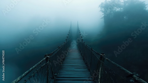 Obraz premium Narrow, creaky bridge over a fog-shrouded ravine, the mist hiding the abyss below, creating a cinematic sense of foreboding and introspection