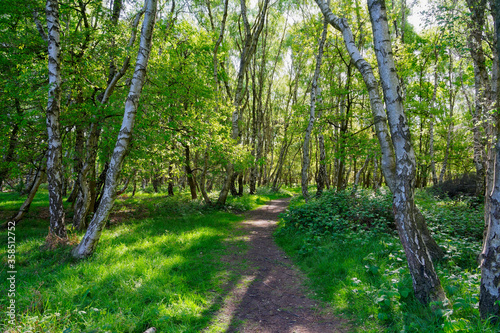 Fototapeta premium Narrow footpath between tall Silver Birch trees on a bright spring morning on...