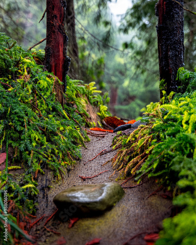 © pobaralia, Obraz premium Narrow forest path leading through lush green forest