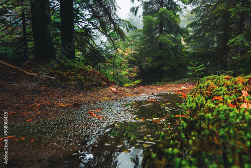 © pobaralia, Fototapeta premium Narrow forest path leading through lush green forest