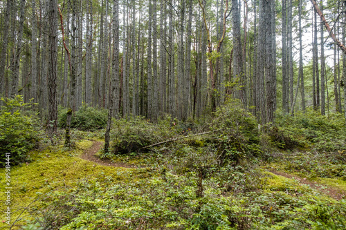 Fototapeta premium narrow hidden trails in the forest with dense tall trees and green bushes all around