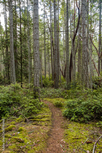 Fototapeta premium narrow hidden trails in the forest with dense tall trees and green bushes all around