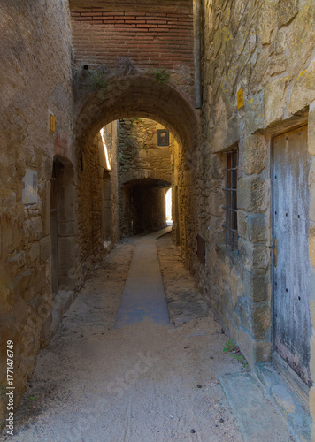 © jocaja, Naklejka premium Narrow medieval alleyway in Madremanya's old town with arched stone passages, rustic walls, wooden doors, and soft ambient light.