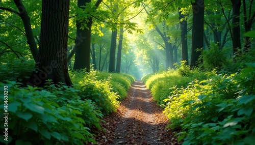 Obraz premium Narrow, overgrown forest path, dappled light filtering through, nature,...