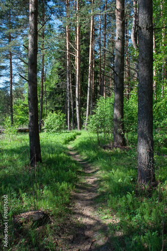 Fototapeta premium Narrow path between pine trees in coniferous forest, sunny summer day
