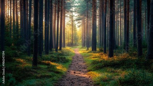 Fototapeta premium Narrow Path Through Enchanting Pine Forest with Towering Trees and Soft Sunlight