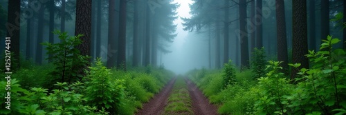 Fototapeta premium Narrow path through foggy woods with tall pines and ferns, pathway, nature