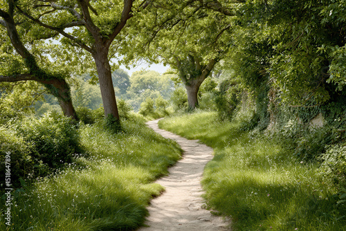 Fototapeta premium narrow path winding through lush summer forest illuminated by ultrabright...