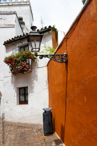 Fototapeta premium Narrow paved lane with hanging lamppost and flower through window in Sevilla Spain
