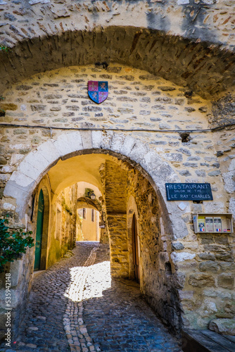 © Pernelle Voyage, Naklejka premium Narrow paved street and old houses in the medieval village of Saint Montan in the south of France (Ardeche)