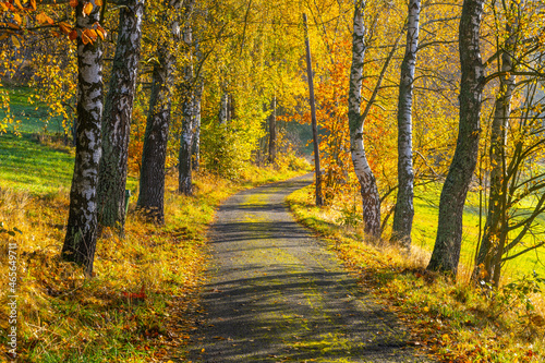 Fototapeta premium Narrow rural asphalt road in autumn time
