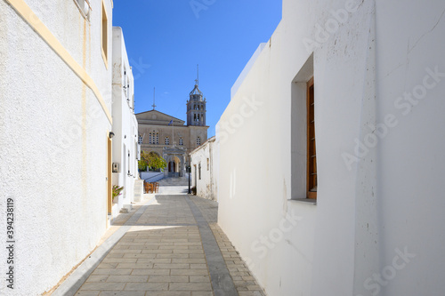 Fototapeta premium Narrow street in Lefkes village on Paros Island. Church of Agia Triada in...