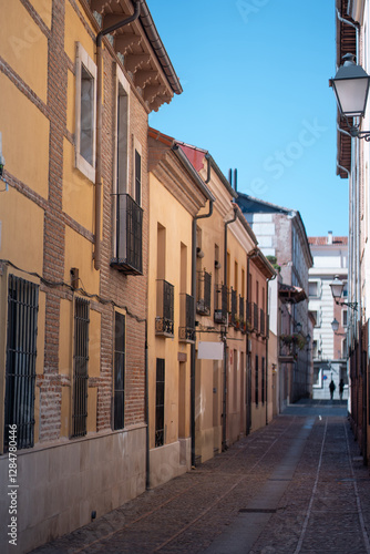 Fototapeta premium Narrow street lined with colorful buildings in a historic neighborhood on a sunny day, Alcala De Henares, Spain