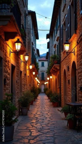 Fototapeta premium Narrow street lit by lamps stone buildings line the path