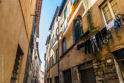 Fototapeta premium Narrow streets of Lucca ancient town with traditional architecture, Italy