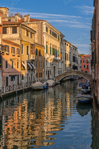 © Dreamnordno, Fototapeta premium Narrow Venetian canals with colorful historic buildings and gondolas