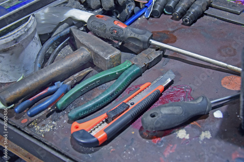 Fototapeta premium Narzędzia leżące na brudnym stole